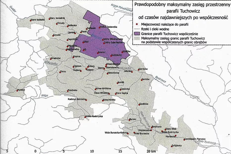 Na podstawie dokumentów można stwierdzić, że obszar parafii tuchowickiej łączył się bezpośrednio z obszarem parafii łukowskiej. Z map wynika, że wymieniony obszar parafii tuchowickiej otoczony był ze wszystkich stron terenem trudnym do przebycia, prawdopodobnie więc, wszystkie miejscowości leżące na tym terenie należały tej parafii.